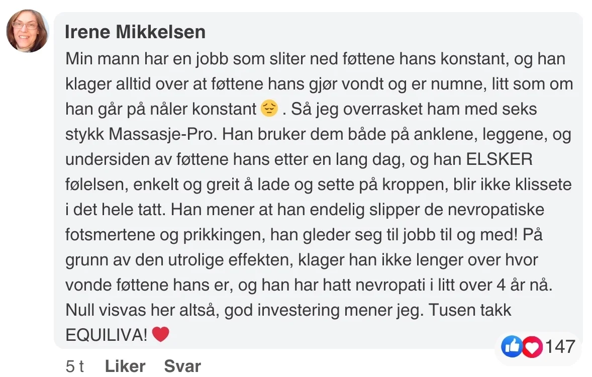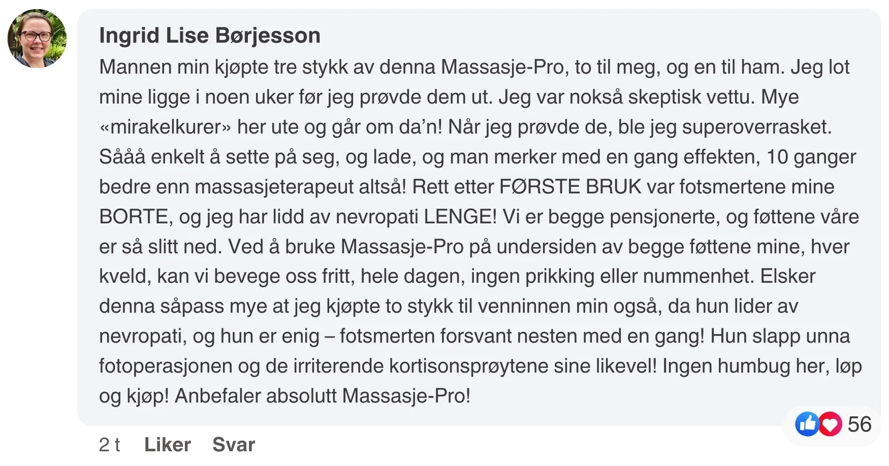 "Jeg har tålt balanseproblemer, nevropatiske fotsmerter, og hevelse i leggene og føttene mine i 20 år nå. En fysioterapeut har vært min eneste "lindring", og det er selvfølgelig kortvarig. Jeg må si, jeg var skeptisk da jeg bestilte mine to stykk Massasje-Pro. Jeg kan nå si, uten tvil, disse massasjerne fungerer folkens! Det gjenstår å se hva de langsiktige effektene vil være, men jeg er veldig optimistisk og ser frem til å kunne gå gjennom arbeidsdagen uten Paracet! Tro meg, jeg har prøvd MANGE "mirakelkurer" på Facebook. Men DETTE er virkelig et mirakel. Jeg klarer å stå oppreist i mer enn en time nå, helt smertefritt også! Så langt er det eneste negative med disse massasjerne, at mannen min stadig stjeler dem fra meg for å bruke dem selv!"