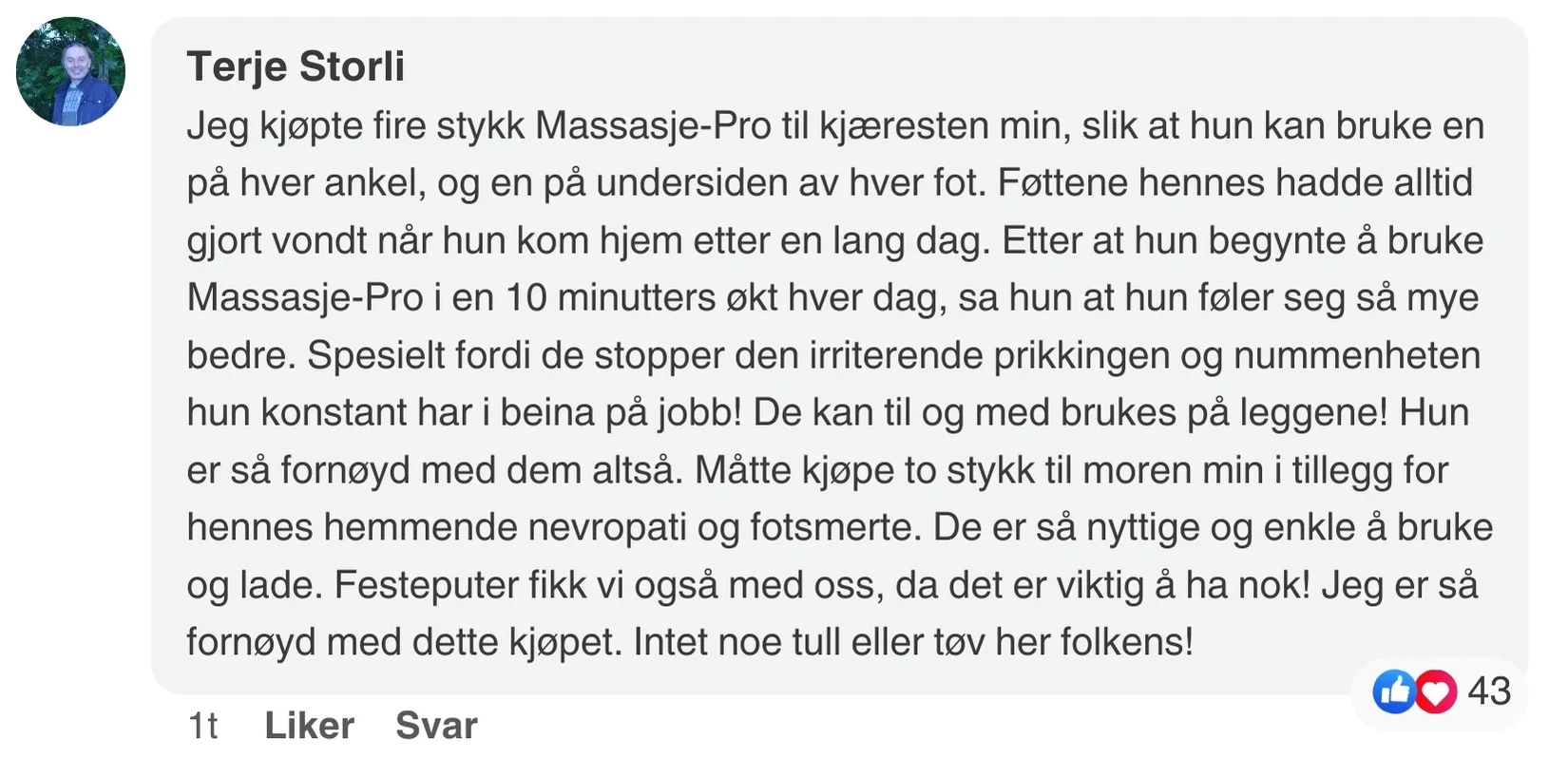 "Jeg var skeptisk på de langvarige effektene, mye tøv her ute om da'n vettu... men jeg bestemte meg for å prøve denne Massasje-Pro fordi jeg har lidd av nevropati, og hevelse i leggene, og føttene mine en stund nå. Jeg tar medisin på resept for smerten, men hvis jeg glemmer å ta en dose, vil smerten minne meg på det med en gang. Den norske bruksanvisningen var enkel å følge, og Massasje-Pro kommer med en "tips om bruk", den hjalp meg VELDIG. Jeg endte opp med å skaffe meg 6 stykk, og brukte 2 av dem på hver av anklene, mine, en på hver av leggene mine, og en på undersiden av mine føtter. Etter en stund glemte jeg bokstavelig talt at jeg pleide å smerte før! Jeg ville ha tatt omtrent fire lykkepiller innen samma tidsperiode uten mine nye Massasje-Pro! Jeg vil anbefale denne massasjeren til alle med smerte, hevelse, eller betennelse i leggene, føttene, eller anklene. Denne dingsen fungerer, ingen svada her folkens."